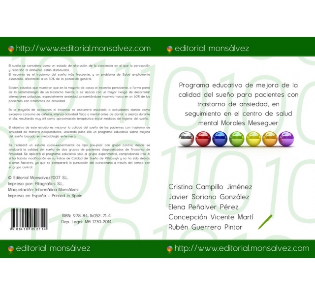 El sueño se considera como un estado de alteración de la conciencia en el que la percepción y reacción al ambiente están disminuidas. El insomnio es el trastorno del sueño más frecuente, y un problema de Salud ampliamente extendido, afectando a un 30% de la población general.Existen estudios que muestran que en la mayoría de casos el insomnio persistente, o forma parte de la sintomatología de un trastorno mental, o se asocia con un mayor riesgo de desarrollar alteraciones psíquicas, especialmente ansiedad, presentándose insomnio hasta en un 60% de los pacientes con trastornos de ansiedad.En la mayoría de ocasiones el insomnio se encuentra asociado a actividades diarias como excesivo consumo de cafeína, intensa actividad física o mental antes de dormir, o siestas durante el día, resultando muy útil como aproximación terapéutica inicial medidas de higiene del sueño.El objetivo de este estudio es mejorar la calidad del sueño de los pacientes con trastorno de ansiedad de manera independiente, utilizando para ello un programa educativo sobre mejora del sueño basado en metodología enfermera.Se realizará un estudio cuasi-experimental de tipo pre-post con grupo control, donde se analizará la calidad del sueño de dos grupos de pacientes diagnosticados de Trastorno de Ansiedad. Se aplicará el programa educativo sólo al grupo experimental, comprobando tras él si ha habido modificación en su Índice de Calidad del Sueño de Pittsburgh y no ha sido debido a otros factores, ya que se comparará la puntuación del cuestionario a través del tiempo con el grupo control.