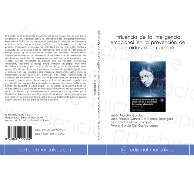 El estudio de la inteligencia emocional (IE) se ha convertido en una pieza fundamental en trabajos sobre la prevención de drogodependencias. Entendemos la IE como la capacidad que tiene el individuo de adaptarse e interaccionar con el entorno, dinámico y cambiante, a raíz de sus propias emociones. El objetivo de este libro es dar una visión amplia y evaluada de la influencia de la inteligencia emocional, la resiliencia, el apoyo social y la autoeficacia, sobre las variables dependientes: motivación, abstinencia y adherencia al tratamiento, en la prevención de recaídas en pacientes en tratamiento por adicción a la cocaína y sus efectos. De los resultados se deduce que las variables inteligencia emocional, resiliencia y apoyo social cumplen un papel importante durante el tratamiento por consumo de cocaína y, por consiguiente, como prevención de recaídas. La IE presenta una relación positiva significativa y directa con las variables dependientes: abstinencia, adherencia al tratamiento y percepción de bienestar tras haber abandonado la conducta de consumo, así como con la probabilidad de permanecer sin consumir a medio plazo. Sin embargo, la IE no ha resultado significativa en relación con las variables dependientes planteadas como hipótesis de tiempo sin consumo a corto plazo. Por su parte, la resiliencia tiene un efecto directo y positivo en la motivación (Resiliencia Autoaceptación) y en la posibilidad de mantenerse sin consumir a corto y medio plazo (Resiliencia Autoaceptación). Con respecto al apoyo social percibido, es relevante en su conexión con la adherencia al tratamiento para el apoyo social sanitario, no así para la familia e iguales.