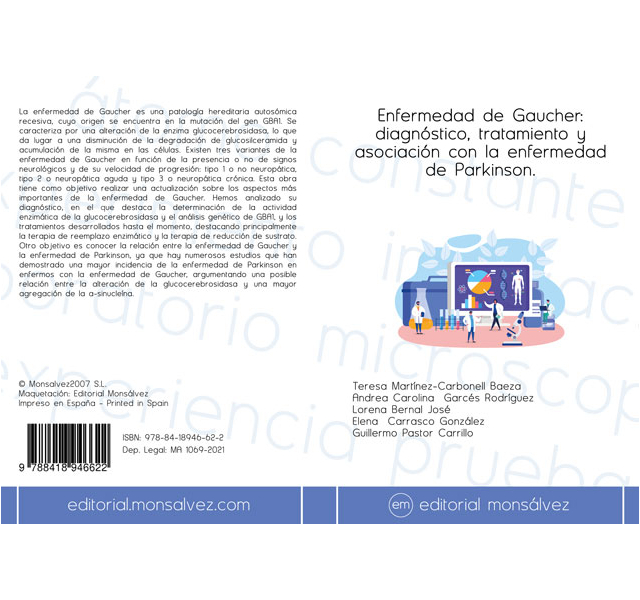 La enfermedad de Gaucher es una patología hereditaria autosómica recesiva, cuyo origen se encuentra en la mutación del gen GBA1. Se caracteriza por una alteración de la enzima glucocerebrosidasa, lo que da lugar a una disminución de la degradación de glucosilceramida y acumulación de la misma en las células. Existen tres variantes de la enfermedad de Gaucher en función de la presencia o no de signos neurológicos y de su velocidad de progresión: tipo 1 o no neuropática, tipo 2 o neuropática aguda y tipo 3 o neuropática crónica. Esta obra tiene como objetivo realizar una actualización sobre los aspectos más importantes de la enfermedad de Gaucher. Hemos analizado su diagnóstico, en el que destaca la determinación de la actividad enzimática de la glucocerebrosidasa y el análisis genético de GBA1, y los tratamientos desarrollados hasta el momento, destacando principalmente la terapia de reemplazo enzimático y la terapia de reducción de sustrato. Otro objetivo es conocer la relación entre la enfermedad de Gaucher y la enfermedad de Parkinson, ya que hay numerosos estudios que han demostrado una mayor incidencia de la enfermedad de Parkinson en enfermos con la enfermedad de Gaucher, argumentando una posible relación entre la alteración de la glucocerebrosidasa y una mayor agregación de la a-sinucleína.