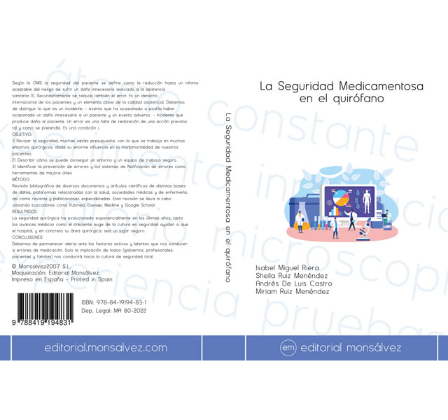 Según la OMS la seguridad del paciente se define como la reducción hasta un mínimo aceptable del riesgo de sufrir un daño innecesario asociado a la asistencia sanitaria (1). Secundariamente se reduce también el error. Es un derecho internacional de los pacientes y un elemento clave de la calidad asistencial. Debemos de distinguir lo que es un incidente. - evento que ha ocasionado o podría haber ocasionado un daño innecesario a un paciente y un evento adverso. - incidente que produce daño al paciente. Un error es una falta de realización de una acción prevista tal y como se pretendía. Es una condición i OBJETIVO: 1) Revisar la seguridad, muchas veces presupuesta, con la que se trabaja en muchos entornos quirúrgicos, dada su enorme influencia en la morbimortalidad de nuestros pacientes. 2) Describir cómo se puede conseguir un entorno y un equipo de trabajo seguro. 3) Identificar la prevención de errores y los sistemas de Notificación de errores como herramientas de mejora útiles MÉTODO: Revisión bibliográfica de diversos documentos y artículos científicos de distintas bases de datos, plataformas relacionadas con la salud, sociedades médicas y de enfermería, así como revistas y publicaciones especializadas. Esta revisión se lleva a cabo utilizando buscadores como Pubmed, Elsevier, Medline y Google Scholar. RESULTADOS: La seguridad quirúrgica ha evolucionado exponencialmente en los últimos años, tanto los avances médicos como el creciente auge de la cultura en seguridad ayudan a que el hospital, y en concreto su área quirúrgica, sea un lugar seguro. CONCLUSIONES: Debemos de permanecer alerta ante los factores activos y latentes que nos conducen a errores de medicación. Solo la implicación de todos (gobiernos, profesionales, pacientes y familias) nos conducirá hacia la cultura de seguridad total.