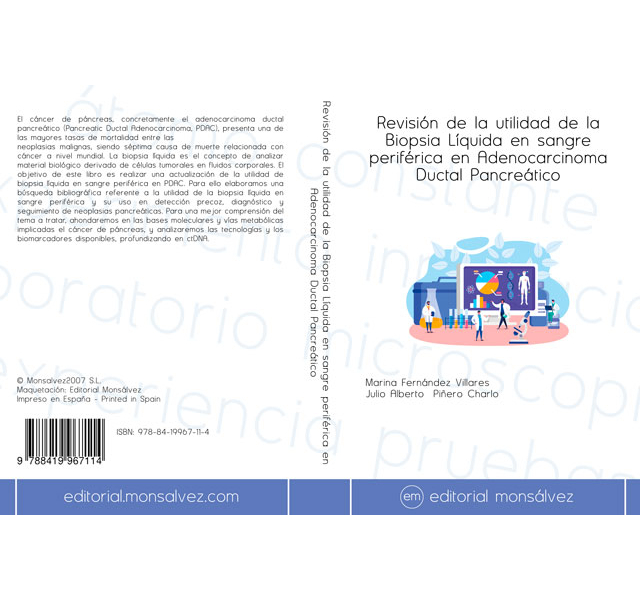 El cáncer de páncreas, concretamente el adenocarcinoma ductal pancreático (Pancreatic Ductal Adenocarcinoma, PDAC), presenta una de las mayores tasas de mortalidad entre las neoplasias malignas, siendo séptima causa de muerte relacionada con cáncer a nivel mundial. La biopsia líquida es el concepto de analizar material biológico derivado de células tumorales en fluidos corporales. El objetivo de este libro es realizar una actualización de la utilidad de biopsia líquida en sangre periférica en PDAC. Para ello elaboramos una búsqueda bibliográfica referente a la utilidad de la biopsia líquida en sangre periférica y su uso en detección precoz, diagnóstico y seguimiento de neoplasias pancreáticas. Para una mejor comprensión del tema a tratar, ahondaremos en las bases moleculares y vías metabólicas implicadas el cáncer de páncreas, y analizaremos las tecnologías y los biomarcadores disponibles, profundizando en ctDNA.