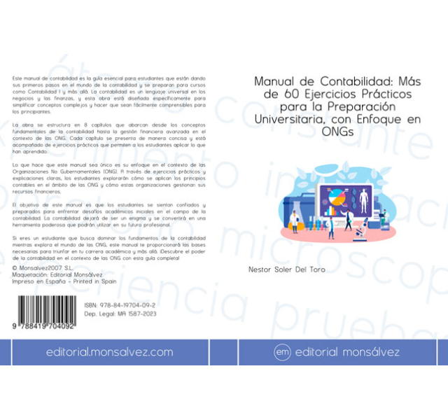 Este manual de contabilidad es la guía esencial para estudiantes que están dando sus primeros pasos en el mundo de la contabilidad y se preparan para cursos como Contabilidad I y más allá. La contabilidad es un lenguaje universal en los negocios y las finanzas, y esta obra está diseñada específicamente para simplificar conceptos complejos y hacer que sean fácilmente comprensibles para los principiantes.La obra se estructura en 8 capítulos que abarcan desde los conceptos fundamentales de la contabilidad hasta la gestión financiera avanzada en el contexto de las ONG. Cada capítulo se presenta de manera concisa y está acompañado de ejercicios prácticos que permiten a los estudiantes aplicar lo que han aprendido.Lo que hace que este manual sea único es su enfoque en el contexto de las Organizaciones No Gubernamentales (ONG). A través de ejercicios prácticos y explicaciones claras, los estudiantes explorarán cómo se aplican los principios contables en el ámbito de las ONG y cómo estas organizaciones gestionan sus recursos financieros.El objetivo de este manual es que los estudiantes se sientan confiados y preparados para enfrentar desafíos académicos iniciales en el campo de la contabilidad. La contabilidad dejará de ser un enigma y se convertirá en una herramienta poderosa que podrán utilizar en su futuro profesional.Si eres un estudiante que busca dominar los fundamentos de la contabilidad mientras explora el mundo de las ONG, este manual te proporcionará las bases necesarias para triunfar en tu carrera académica y más allá. ¡Descubre el poder de la contabilidad en el contexto de las ONG con esta guía completa!