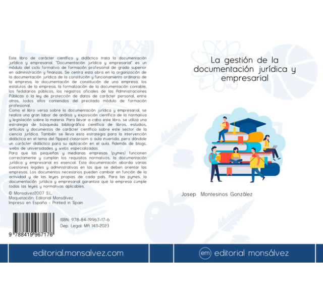 Este libro de carácter científico y didáctico trata la documentación jurídica y empresarial. "Documentación jurídica y empresarial" es un módulo del ciclo formativo de formación profesional de grado superior en administración y finanzas. Se centra esta obra en la organización de la documentación jurídica de la constitución y funcionamiento ordinario de la empresa, la documentación de constitución de una empresa, los estatutos de la empresa, la formalización de la documentación contable, los fedatarios públicos, los registros oficiales de las Administraciones Públicas o la ley de protección de datos de carácter personal, entre otros, todos ellos contenidos del precitado módulo de formación profesional. Como el libro versa sobre la documentación jurídica y empresarial, se realiza una gran labor de análisis y exposición científica de la normativa y legislación sobre la materia. Para llevar a cabo este libro, se utiliza una estrategia de búsqueda bibliográfica científica de libros, estudios, artículos y documentos de carácter científico sobre este sector de la ciencia jurídica. También se lleva esta estrategia para la intervención didáctica en el tema del flipped classroom o aula invertida, pero dándole un carácter didáctico para su aplicación en el aula. Además de blogs, webs de universidades y webs especializadas. Para que las pequeñas y medianas empresas (pymes) funcionen correctamente y cumplan los requisitos normativos, la documentación jurídica y empresarial es esencial. Esta documentación aborda varias cuestiones legales y administrativas en las que se deben orientar las empresas. Los documentos necesarios pueden cambiar en función de la actividad y de las leyes propias de cada país. Para las pymes, la documentación jurídica y empresarial garantiza que la empresa cumple todas las leyes y normativas aplicables.