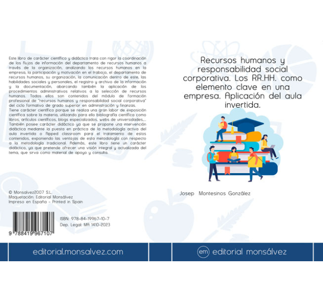 Este libro de carácter científico y didáctico trata con rigor la coordinación de los flujos de información del departamento de recursos humanos a través de la organización, analizando los recursos humanos en la empresa, la participación y motivación en el trabajo, el departamento de recursos humanos, su organización, la comunicación dentro de este, las habilidades sociales y personales, el registro y archivo de la información y la documentación, abarcando también la aplicación de los procedimientos administrativos relativos a la selección de recursos humanos. Todos ellos son contenidos del módulo de formación profesional de "recursos humanos y responsabilidad social corporativa" del ciclo formativo de grado superior en administración y finanzas. Tiene carácter científico porque se realiza una gran labor de exposición científica sobre la materia, utilizando para ello bibliografía científica como libros, artículos científicos, blogs especializados, webs de universidades,... También posee carácter didáctico ya que se propone una intervención didáctica mediante la puesta en práctica de la metodología activa del aula invertida o flipped classroom para el tratamiento de estos contenidos, exponiendo las ventajas de esta metodología con respecto a la metodología tradicional. Además, este libro tiene un carácter didáctico, ya que pretende ofrecer una visión integral y actualizada del tema, que sirva como material de apoyo y consulta.