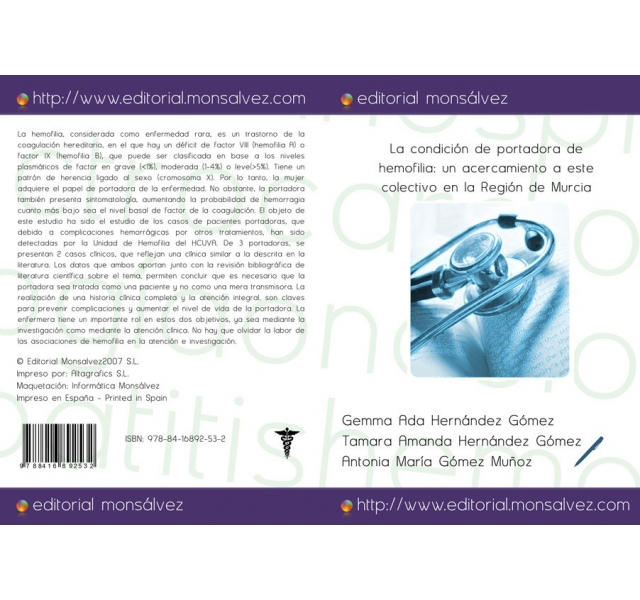 La hemofilia, considerada como enfermedad rara, es un trastorno de la coagulación hereditario, en el que hay un déficit de factor VIII (hemofilia A) o factor IX (hemofilia B), que puede ser clasificada en base a los niveles plasmáticos de factor en grave (<1%), moderada (1-4%) o leve(>5%). Tiene un patrón de herencia ligado al sexo (cromosoma X). Por lo tanto, la mujer adquiere el papel de portadora de la enfermedad. No obstante, la portadora también presenta sintomatología, aumentando la probabilidad de hemorragia cuanto más bajo sea el nivel basal de factor de la coagulación. El objeto de este estudio ha sido el estudio de los casos de pacientes portadoras, que debido a complicaciones hemorrágicas por otros tratamientos, han sido detectadas por la Unidad de Hemofilia del HCUVA. De 3 portadoras, se presentan 2 casos clínicos, que reflejan una clínica similar a la descrita en la literatura. Los datos que ambos aportan junto con la revisión bibliográfica de literatura científica sobre el tema, permiten concluir que es necesario que la portadora sea tratada como una paciente y no como una mera transmisora. La realización de una historia clínica completa y la atención integral, son claves para prevenir complicaciones y aumentar el nivel de vida de la portadora. La enfermera tiene un importante rol en estos dos objetivos, ya sea mediante la investigación como mediante la atención clínica. No hay que olvidar la labor de las asociaciones de hemofilia en la atención e investigación.