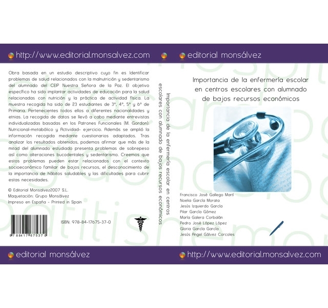Obra basada en un estudio descriptivo cuyo fin es Identificar problemas de salud relacionados con la malnutrición y sedentarismo del alumnado del CEIP Nuestra Señora de la Paz. El objetivo específico ha sido implantar actividades de educación para la salud relacionadas con nutrición y la práctica de actividad física. La muestra recogida ha sido de 23 estudiantes de 3º, 4º, 5º y 6º de Primaria. Pertenecientes todos ellos a diferentes nacionalidades y etnias. La recogida de datos se llevó a cabo mediante entrevistas individualizadas basadas en los Patrones Funcionales (M. Gordon): Nutricional-metabólico y Actividad- ejercicio. Además se amplió la información recogida mediante cuestionarios adaptados. Tras analizar los resultados obtenidos, podemos afirmar que más de la mitad del alumnado estudiado presenta problemas de sobrepeso así como alteraciones bucodentales y sedentarismo. Creemos que estos problemas pueden estar relacionados con el contexto socioeconómico familiar de bajos recursos, el desconocimiento de la importancia de hábitos saludables y las dificultades para cubrir estas necesidades.